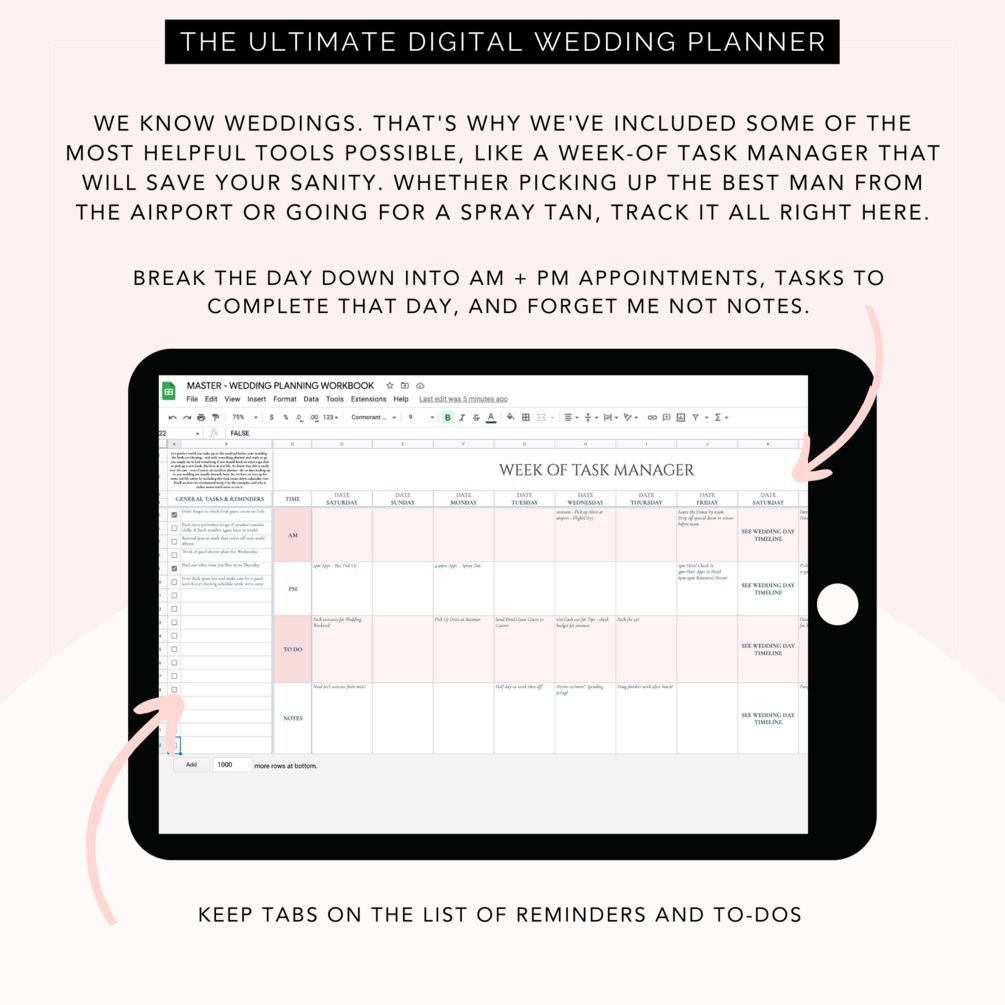 *Wedding logistics are no joke. We've included a week-of planner that will help you keep it together before the event ('cause it can be mayhem), plus a simple and master day-of timeline to manage the big day itself.