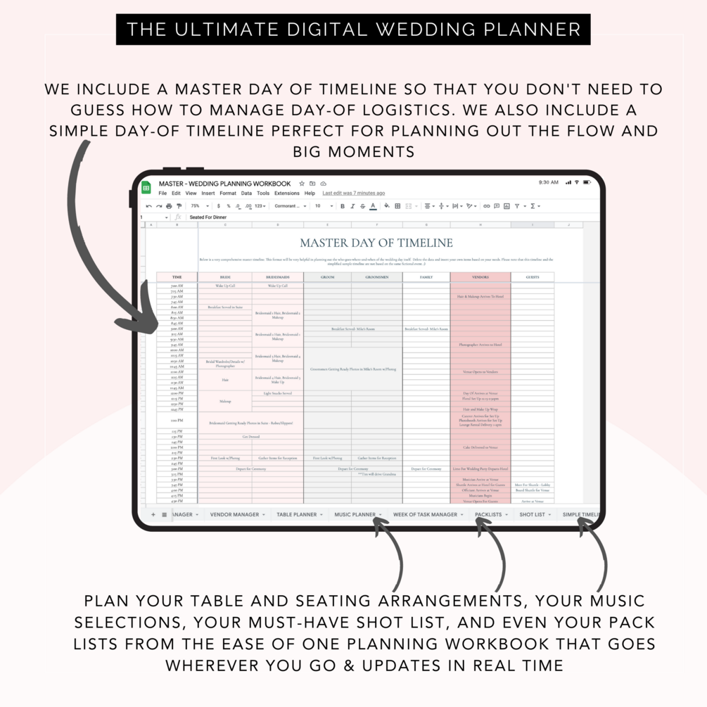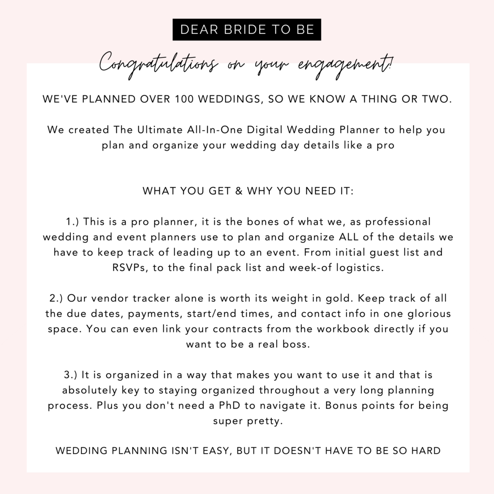 We've planned over 100 weddings, so we know a thing or two. We created The Ultimate All-In-One Digital Wedding Planner to help you plan and organize your wedding day details like a pro.